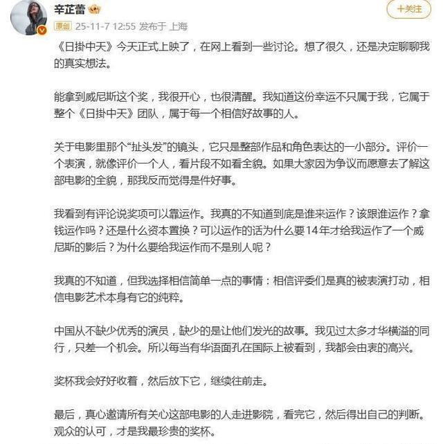 随后更是灵魂六问: “我真的不知道奖项还可以靠运作,是谁来运作?该跟谁运作?拿钱运作吗?还是资本置换?“ ”能运作的话,为什么要等14年才给我一个运作的威尼斯影后的头衔?为什么是我而不是别人?”怼的人哑口无言!
