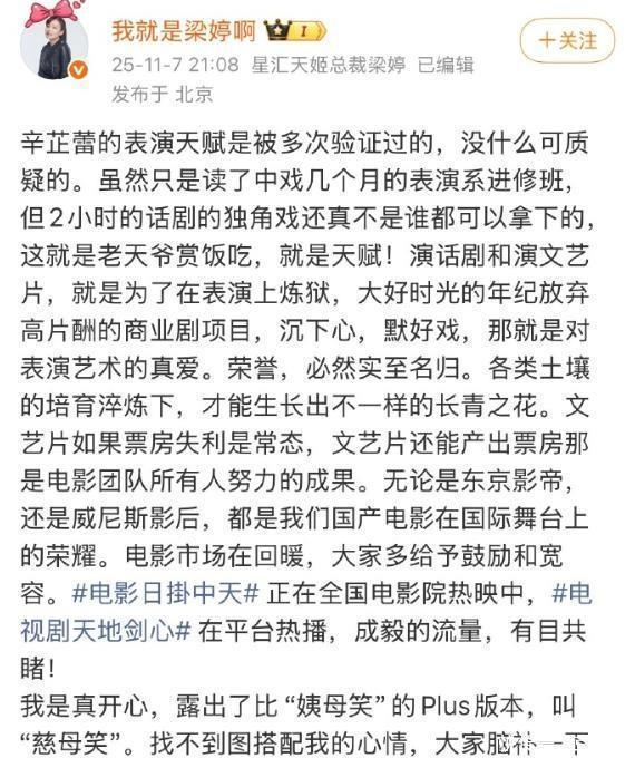 她认为中国从来都不缺好演员,缺少的是让他们发光的故事,这样硬气而又体面的回应,更是引得了大家的点赞。 在她回应之后,她的前经纪人梁婷也在第一时间发声力挺。